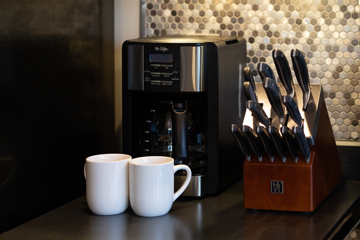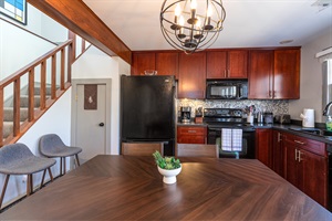 On the main floor, you’ll find cozy living space and kitchen along with one bedroom. The main level is open and modern, featuring a wood-burning fireplace, smart TV, and a large sofa and side chairs. The sofa is a sleeper bed, offering additional sleeping arrangements. The open kitchen design ensures that everyone can socialize together without feeling separated. On the second floor, the primary bedroom features a king-sized bed and ensuite bathroom. Bed linens and towels are provided for the max occupancy of the home (Carol's Cottage has a max occupancy of 6). Laundry is available in the home during your stay, located upstairs.